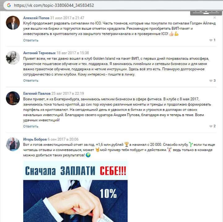 Неладное заметил один из пользователей сети интернет на всем известной социальной сети. Начинающий инвестор или просто человек, который интересуется данной тематикой, заметил то, что в мошенническом клубе для инвесторов Golden Island нет никаких негативных комментариев о работе системы. В этом мире нет ничего идеального, везде есть ошибки, друзья.