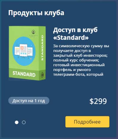 Далее, разберем более подробно продуты данной преступной организации. Мошенники предлагают два продукта на выбор. Первый - абонентская плата 299 долларов США. В данном доступе в клуб вы получаете доступ в закрытый клуб инвесторов, полный курс обучения, телеграмм бота и готовый инвестиционный портфель, который, якобы, поможет Вам зарабатывать.