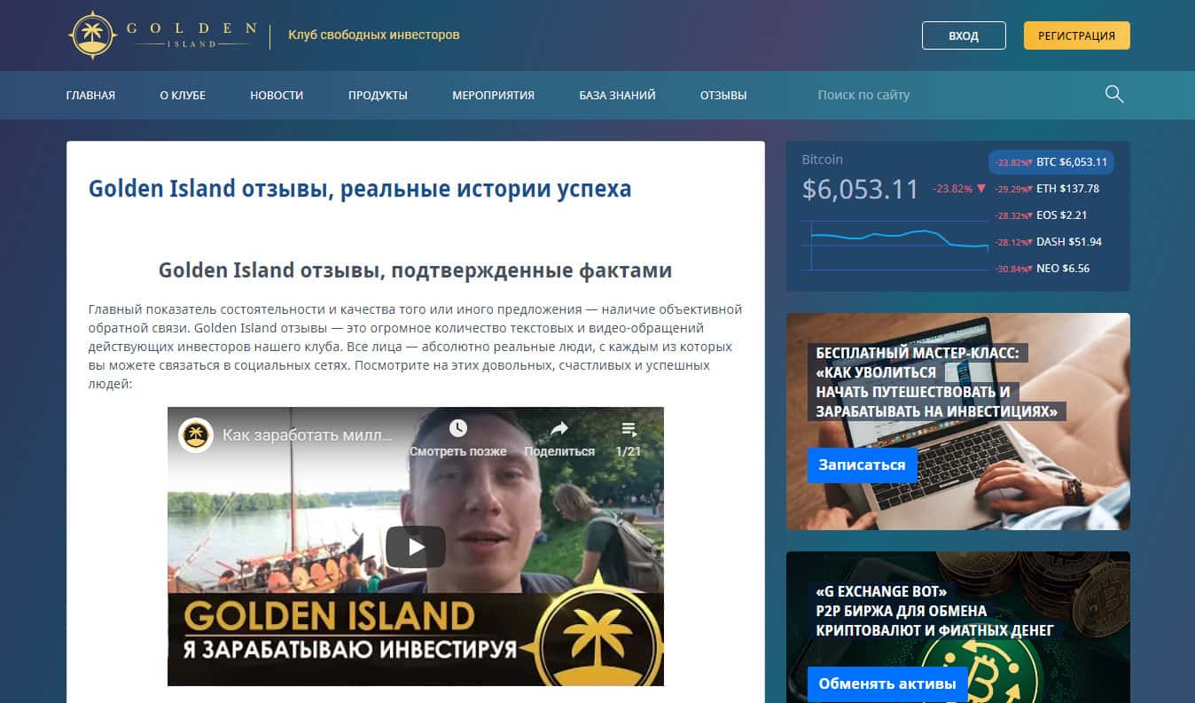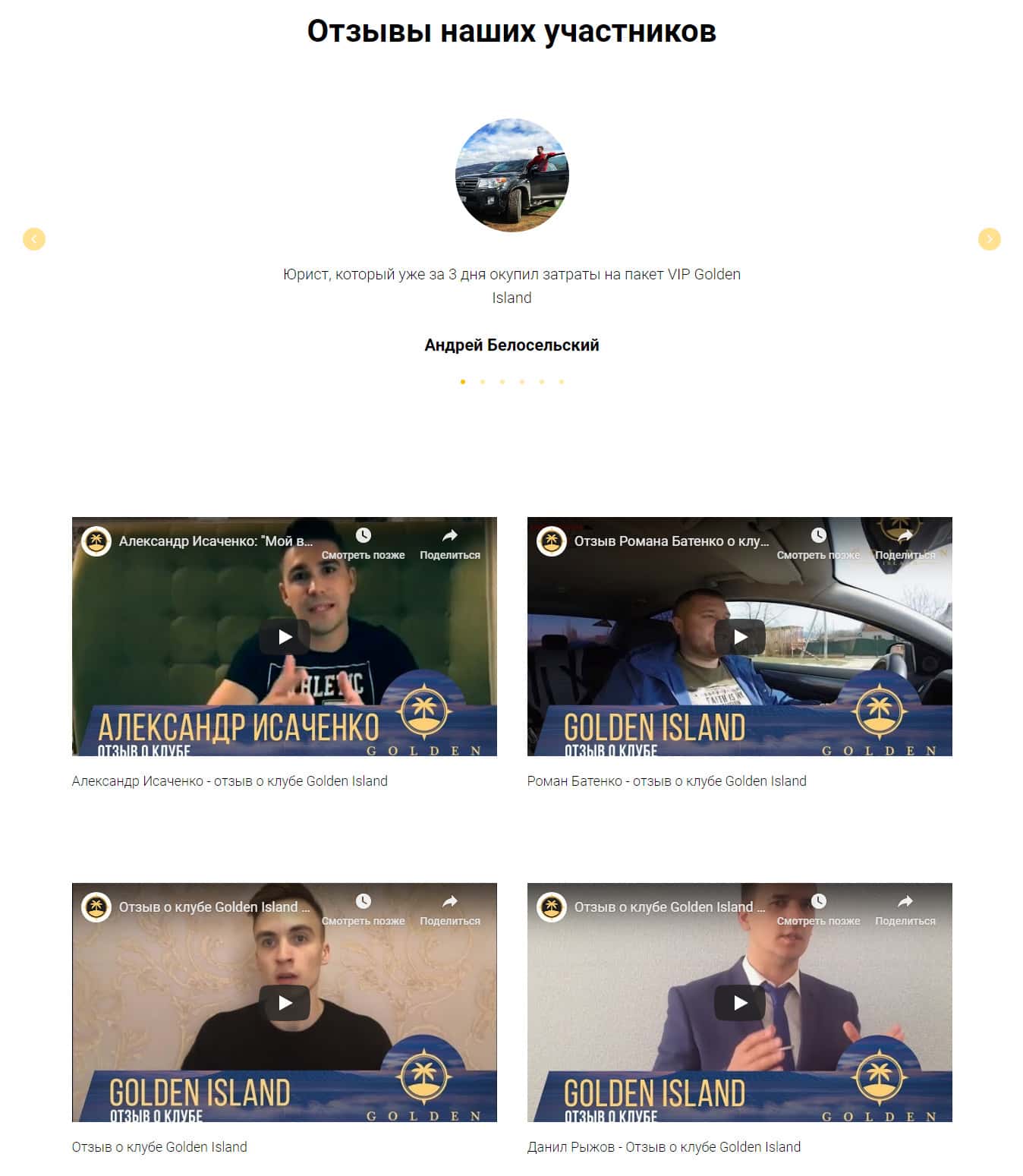 Перейдем к интересным отзывам от мошеннической конторы Golden Island на одном из официальных сайтов. Здесь, шулера выложили видео, с якобы их клиентами, которые рассказывают, все как один, что это классная контора, и что на ней можно, якобы зарабатывать. Но на самом деле, слышно, как данные люди далеко не уверенно говорят о данной крипто-кухне.