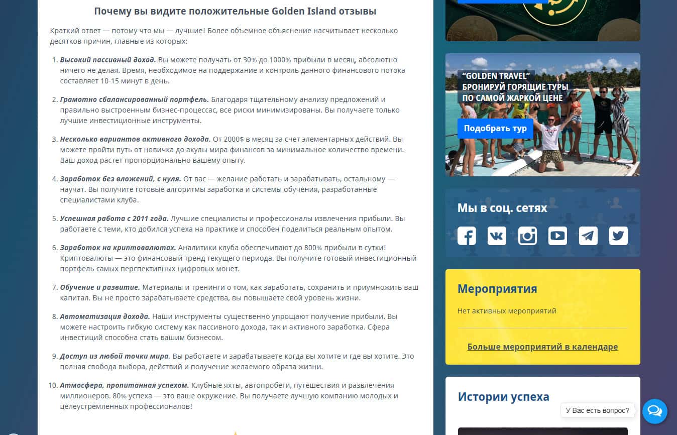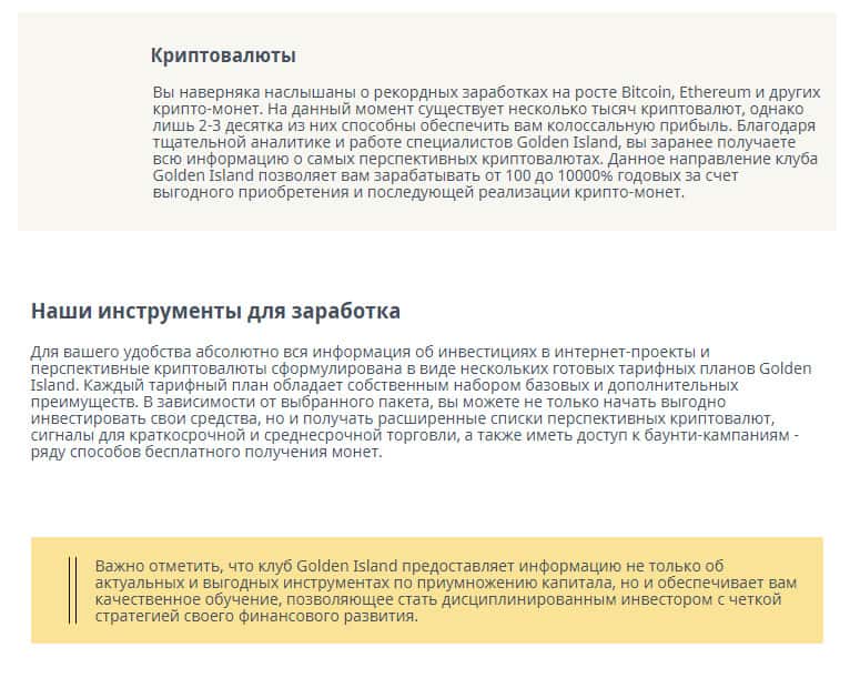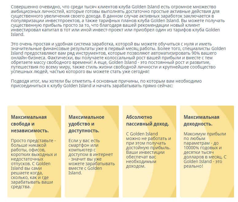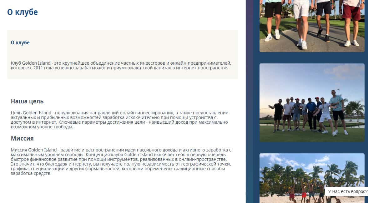 - Подробно о клубе Golden Island с вкладки на главном сайте мошенников