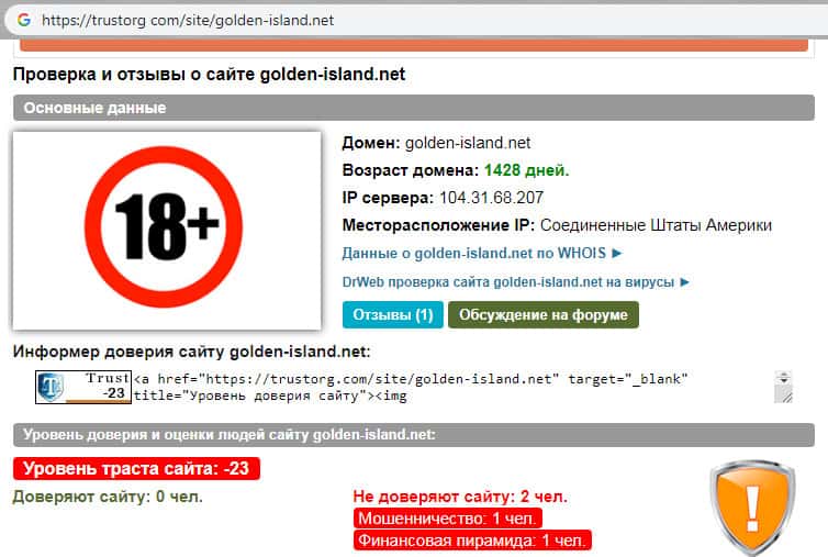 Со вторым сайтом противозаконной организации Голден Исланд всё куда хуже. Уровень траста данного сайта -23, что, как бы, намекает на то, что это не чистый брокер, и работает он очень и очень грязно. Кроме того, есть и отрицательные отзывы пользователей в сети, на этом форуме. Также, утверждается, что это мошенничество и финансовая пирамида от 2 человек.