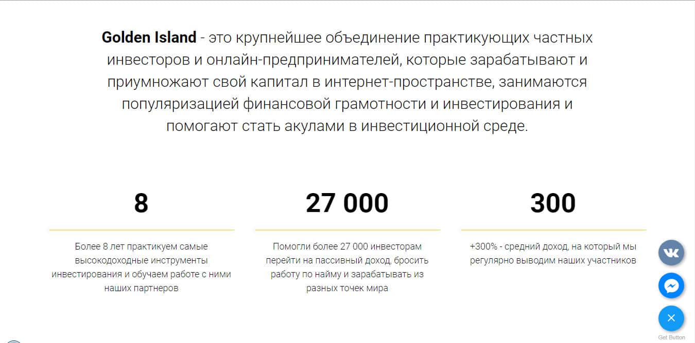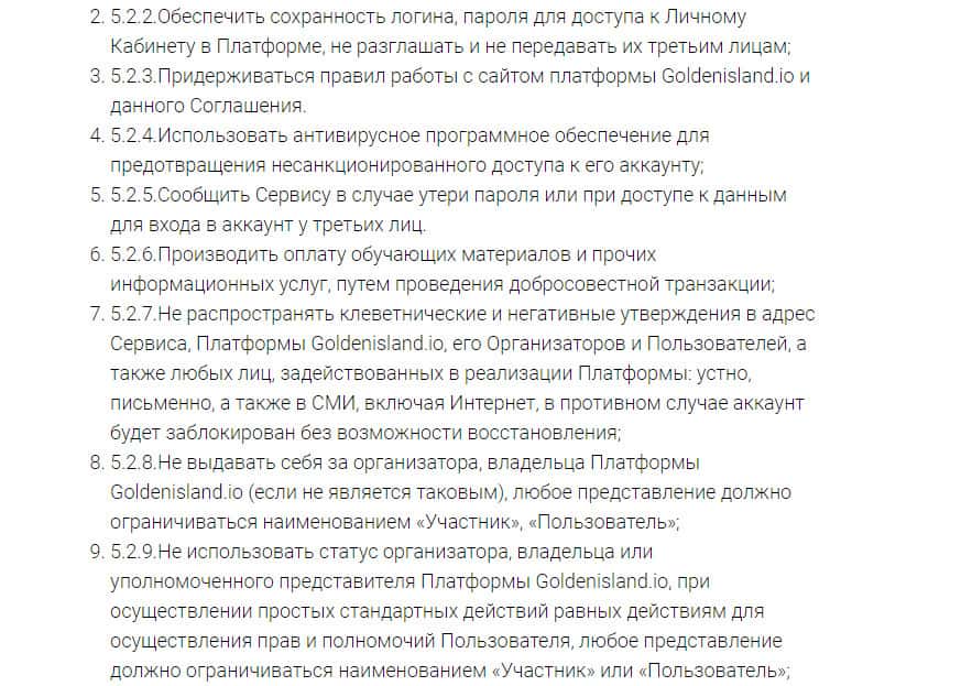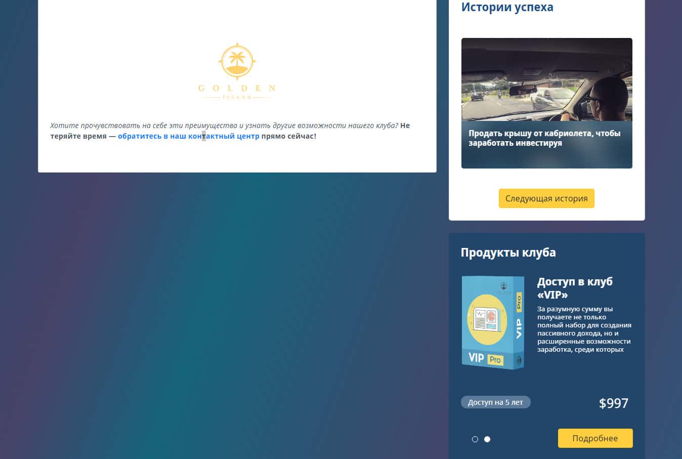 Пострадавший пользователь рассказывает, что всё, что обещают мошенники из данной шарашкиной конторы Голден Исланд вранье и провокация на то, чтобы доверчивые пользователи специально вкладывали в них деньги и покупали у них годовой абонемент на сотрудничество и на обучение инвестированию в разные виды компаний, какими бы они не были.