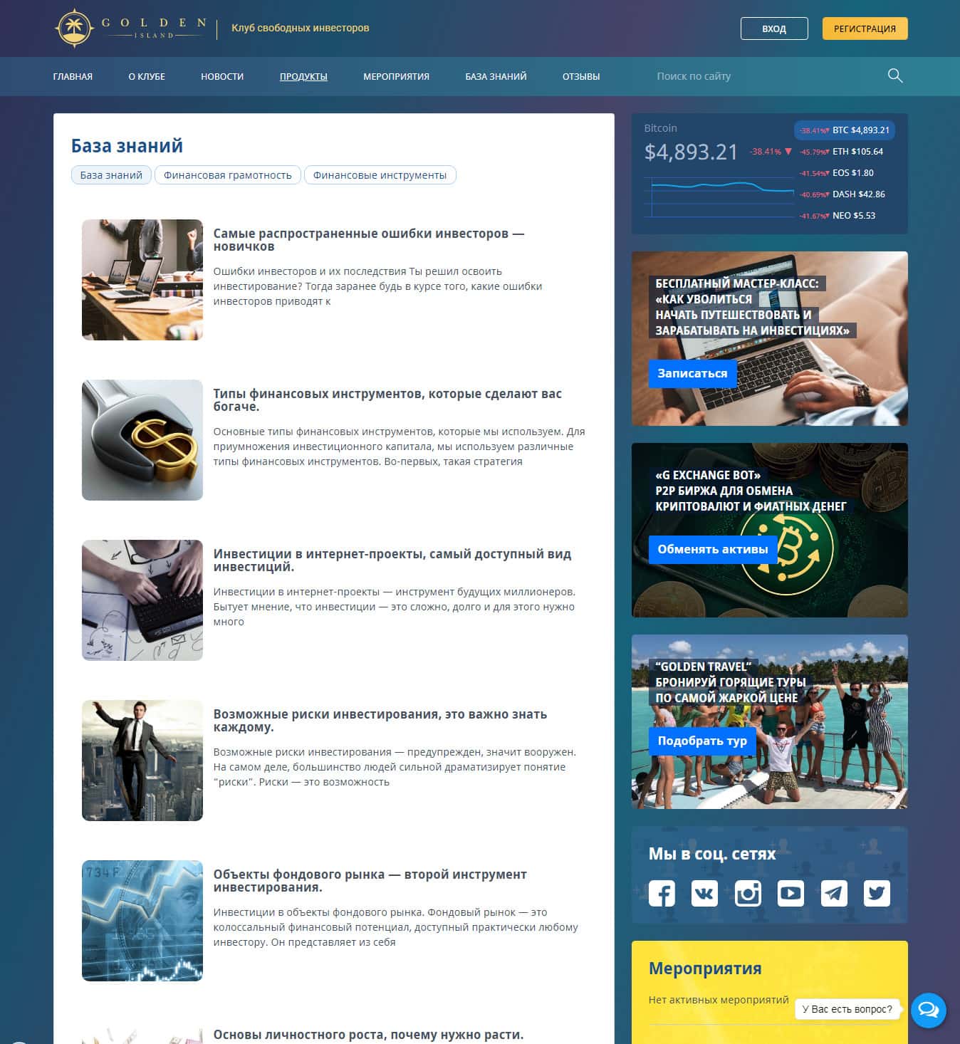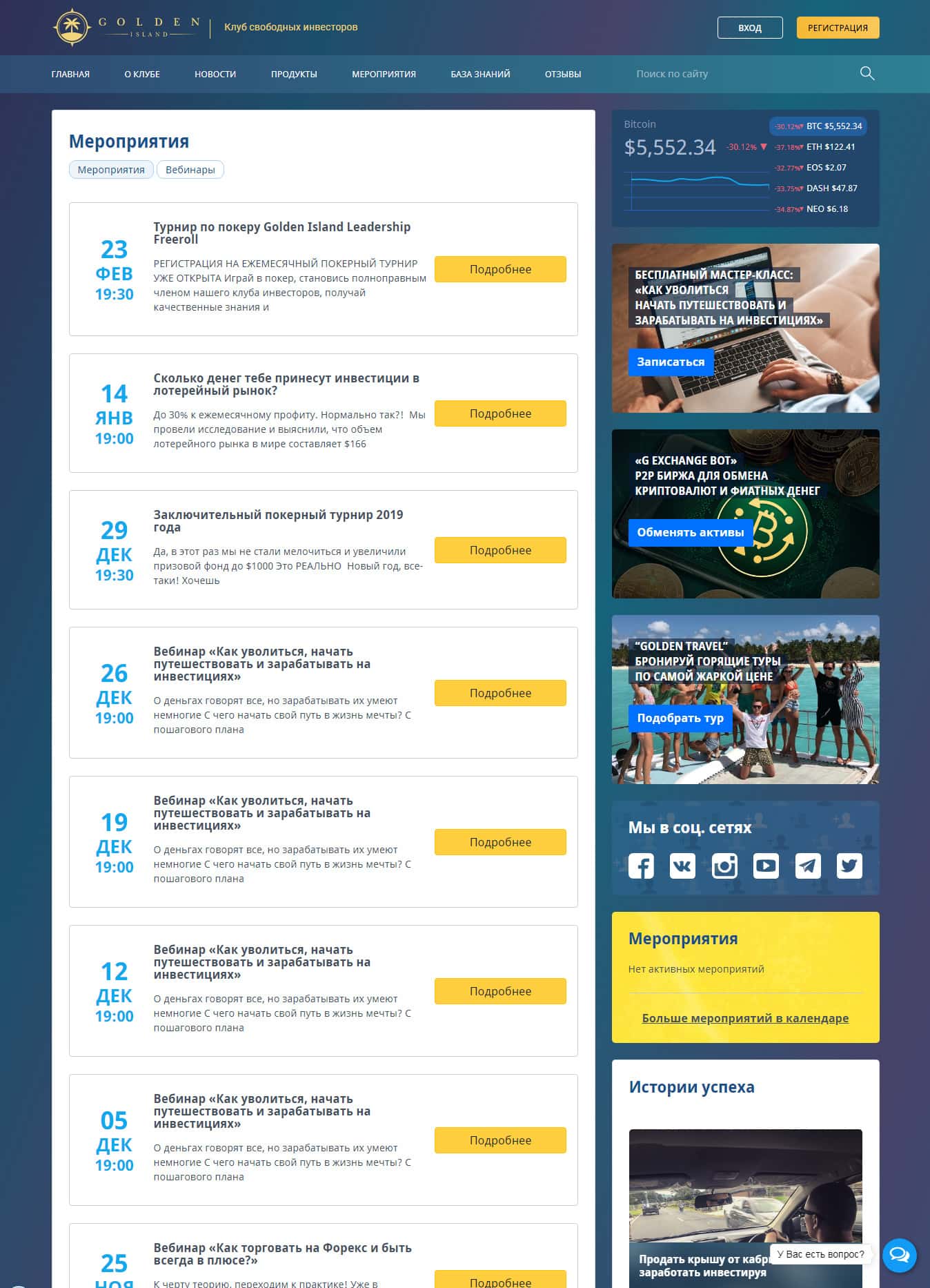 На главном сайте данной конторы есть вкладка с информацией о мероприятиях, которые будут проводиться от конторы Голден Исланд. Расписаны дни и время, в которые будут проводиться те или иные турниры, вебинары и прочее. Помните, что всё, что предлагает Вам данная противозаконная организация - прямое заговаривание языка для приманивания Вас.