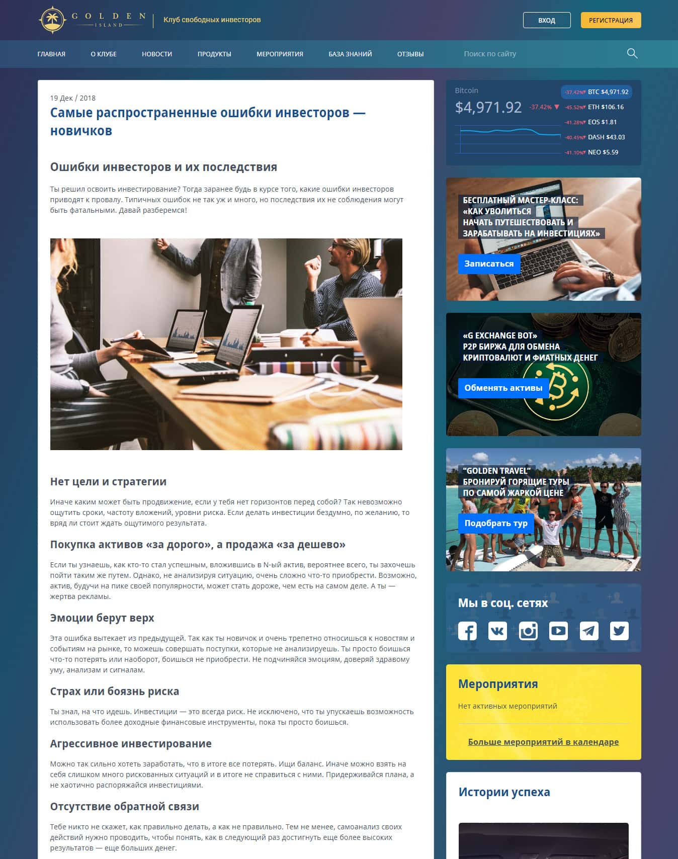 Рассмотрим поближе одну из повторяющихся статей на одном из официальных сайтов преступной организации под названием Golden Island. Здесь, шулера рассказывают то, какие ошибки допускают инвесторы и каковы их последствия, которые отобразятся в будущем. Выглядит это, на первый взгляд, очень даже умно, но присмотревшись, видно что лапша на уши.