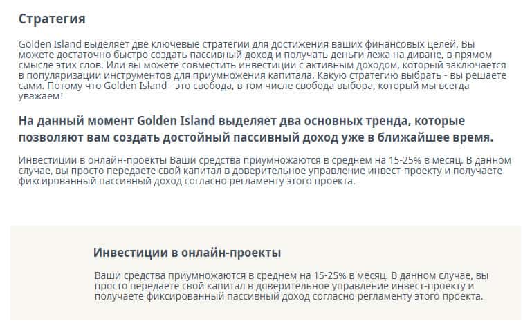 Обещая, что через какое-то время Вы будете кататься на золотых горах и иметь золотые слитки в своём доме и на счету в банке, мошенники из мошеннического клуба Голден Исланд, так же, выделяют два аспекта пассивного дохода. Инвестиции в онлайн проекты, которые проживут не долго, и Вы потеряете заработок, который вложили, а мошенники будут наживаться.