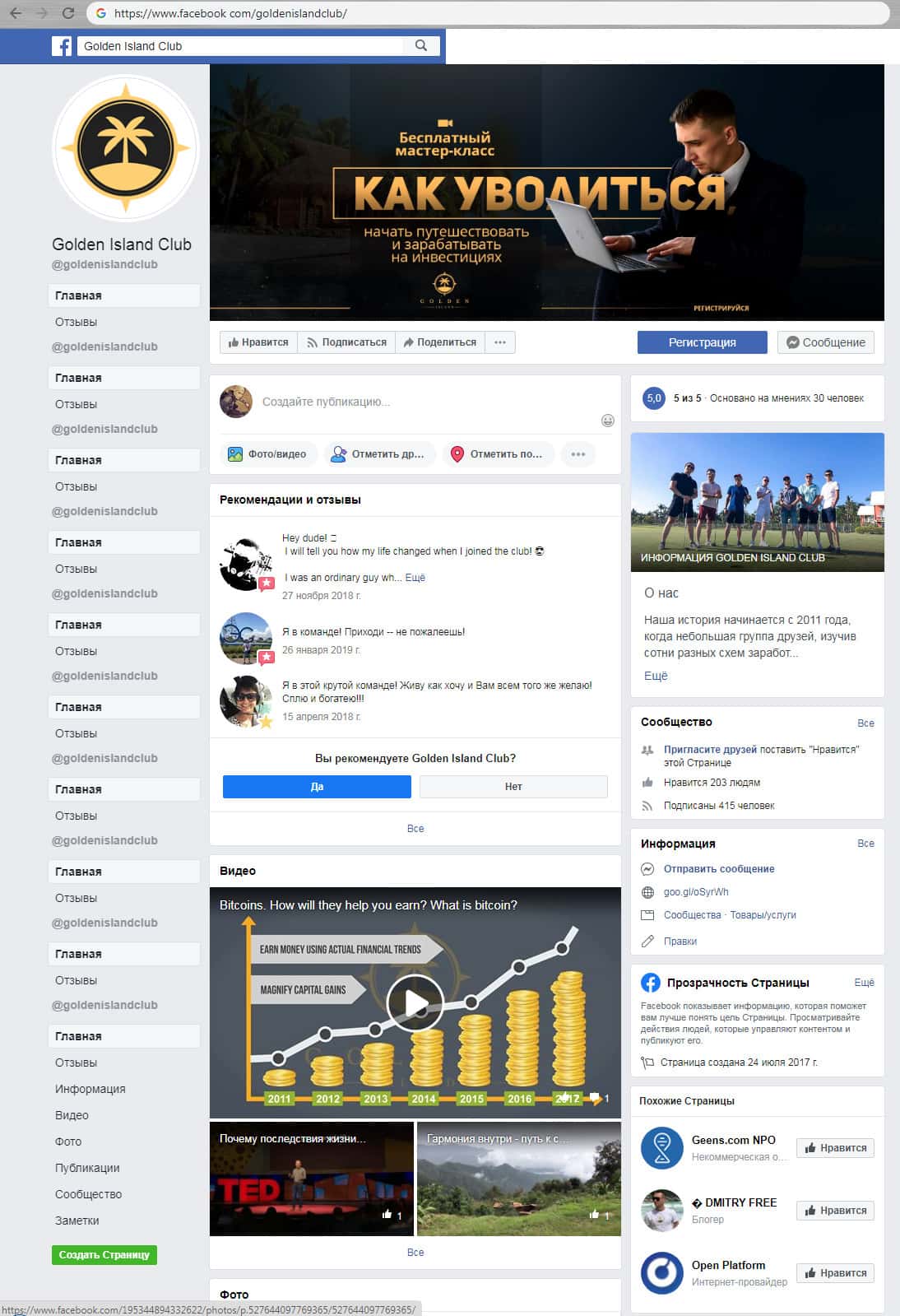 facebook com - социальная сеть с данными о мошеннической конторе Голден Исланд