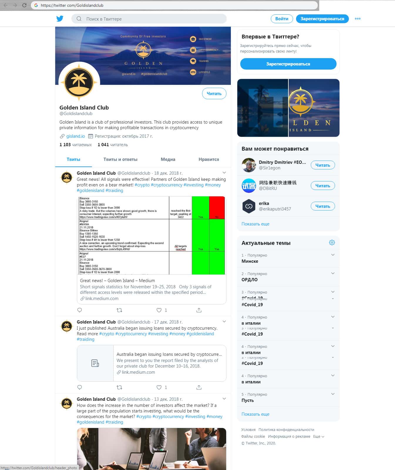 - страница мошеннической организации Golden Island на странице в Твиттер twitter com/Goldislandclub