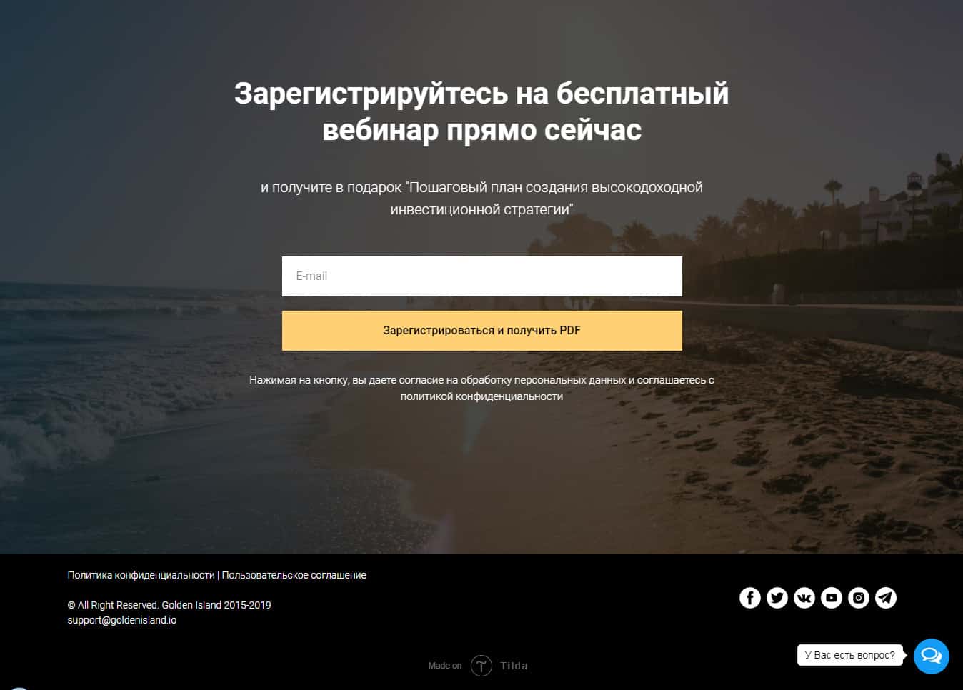В конце сайта мошеннической организации Голден Исланд расположили информацию о бесплатном вебинаре, который они проводят. Данная контора зазывает пользователей сети приходить им на этот вебинар и начать зарабатывать в их мошеннической конторе. Мошенники с помощью таких вебинаров промывают Вам мозг своими обещаниями обучить инвестированию.