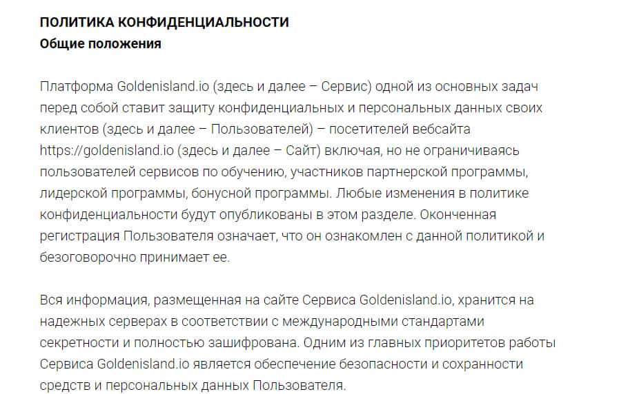 Мошенники обещают Вам, что все данные, хранящиеся на их сервере надежно зашифрованы и не подлежат изменению. Тем не менее, шарашкина крипто-кухня Голден Исланд может изменять свою политику конфиденциальности в любое время без Вашего уведомления об этом на своём сайте, что является не честным, ибо, Вы не узнаете были ли изменения.