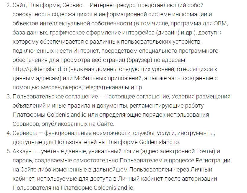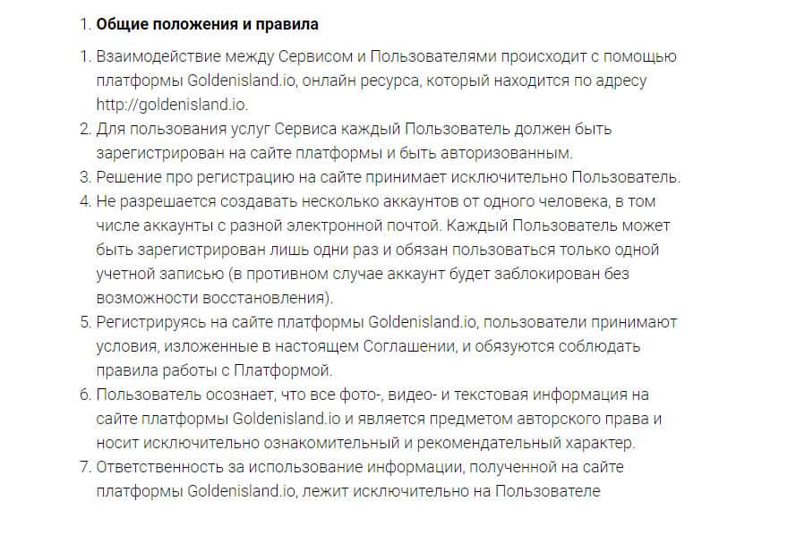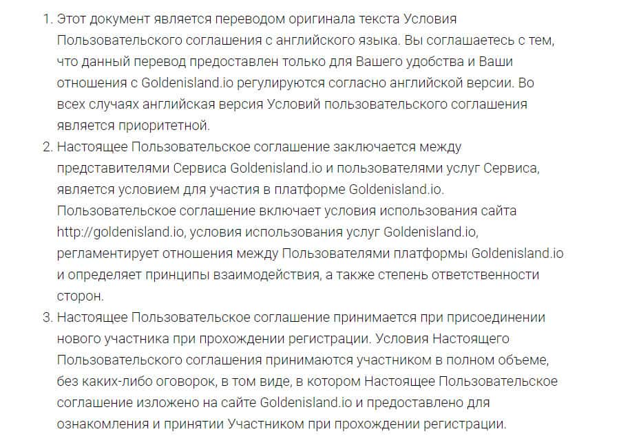 Как можно заметить с первых слов о пользовательском соглашении, мошенническая контора Golden Island переводила данный документ с английского языка, который является языком оригинала. На что стоит обратить внимание, так это на то, что мошенники не предоставляют оригинал данного документа на своём сайте, а только оставляют примечание о нем.