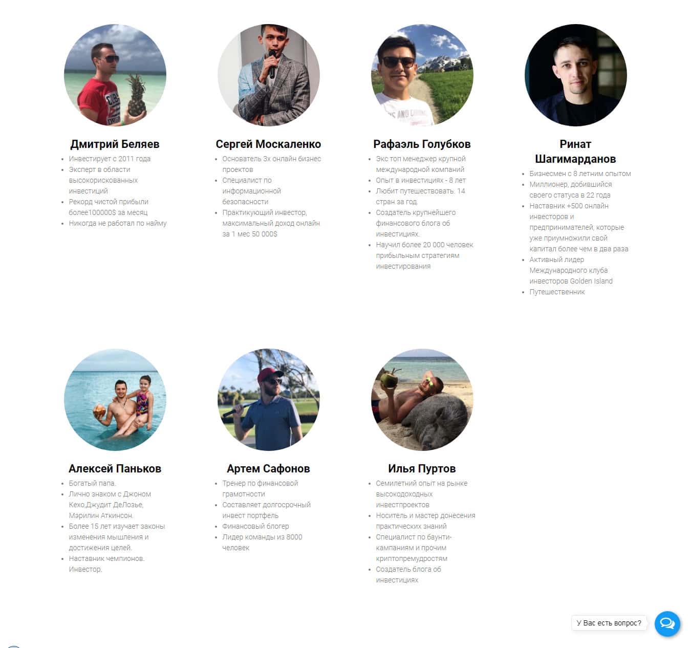 На официальном сайте конторы под названием Голден Исланд есть информация о спикерах но нет информации о главе и подопечном, которые был упомянуты в комментариях выше. На данный момент, перечислено семь спикеров, которые, якобы, помогают Вам инвестировать во всё что только можно. Давайте же посмотрим на данных людей поближе: