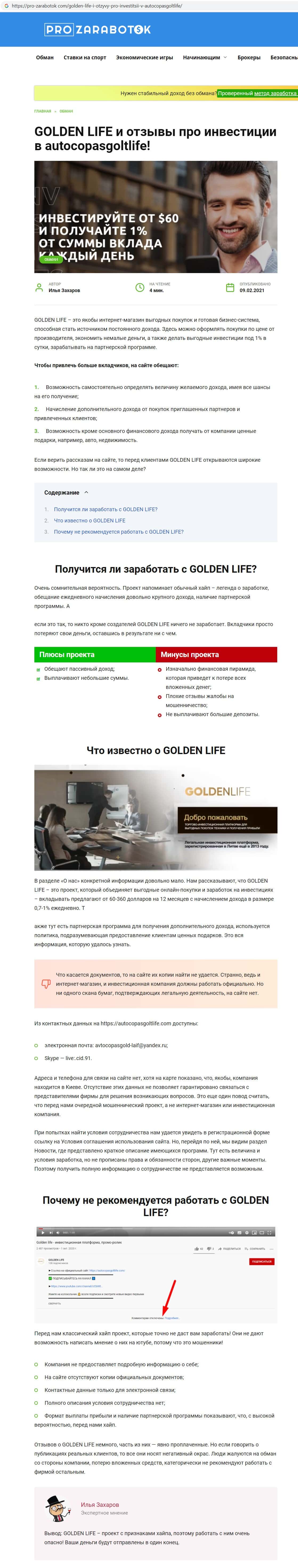Сайт pro-zarabotok com опубликовал статью о мошенниках Голден Лайф, в которой сообщил, что данная организация имеет все признаки хайпа, и с ней опасно связываться.