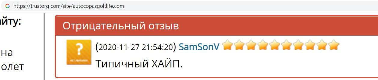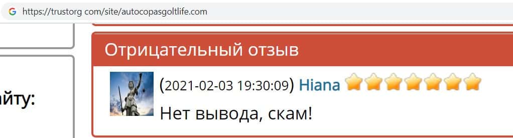 - Отзывы интернет пользователей о фирме разводил AutoCopasGoltLife