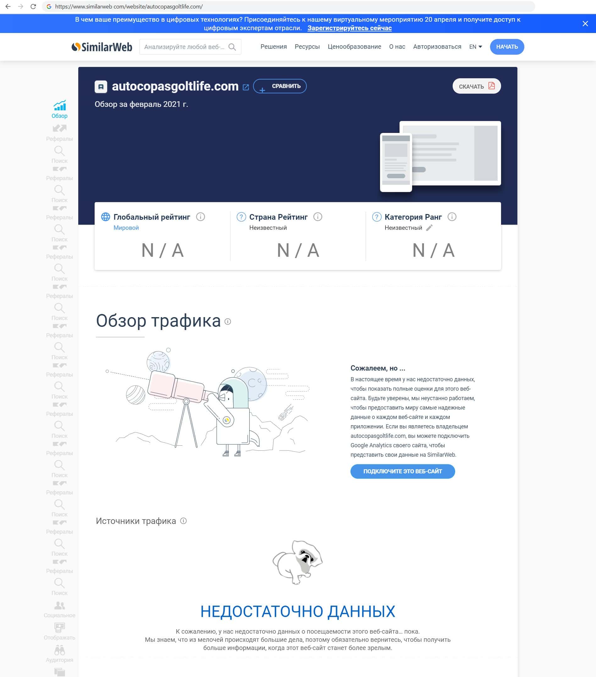 Мы использовали сайт similarweb com, чтобы узнать трафик сайта мошенников Голден Лайф. Оказалось, что международный сервис не обладает информацией о жуликах.