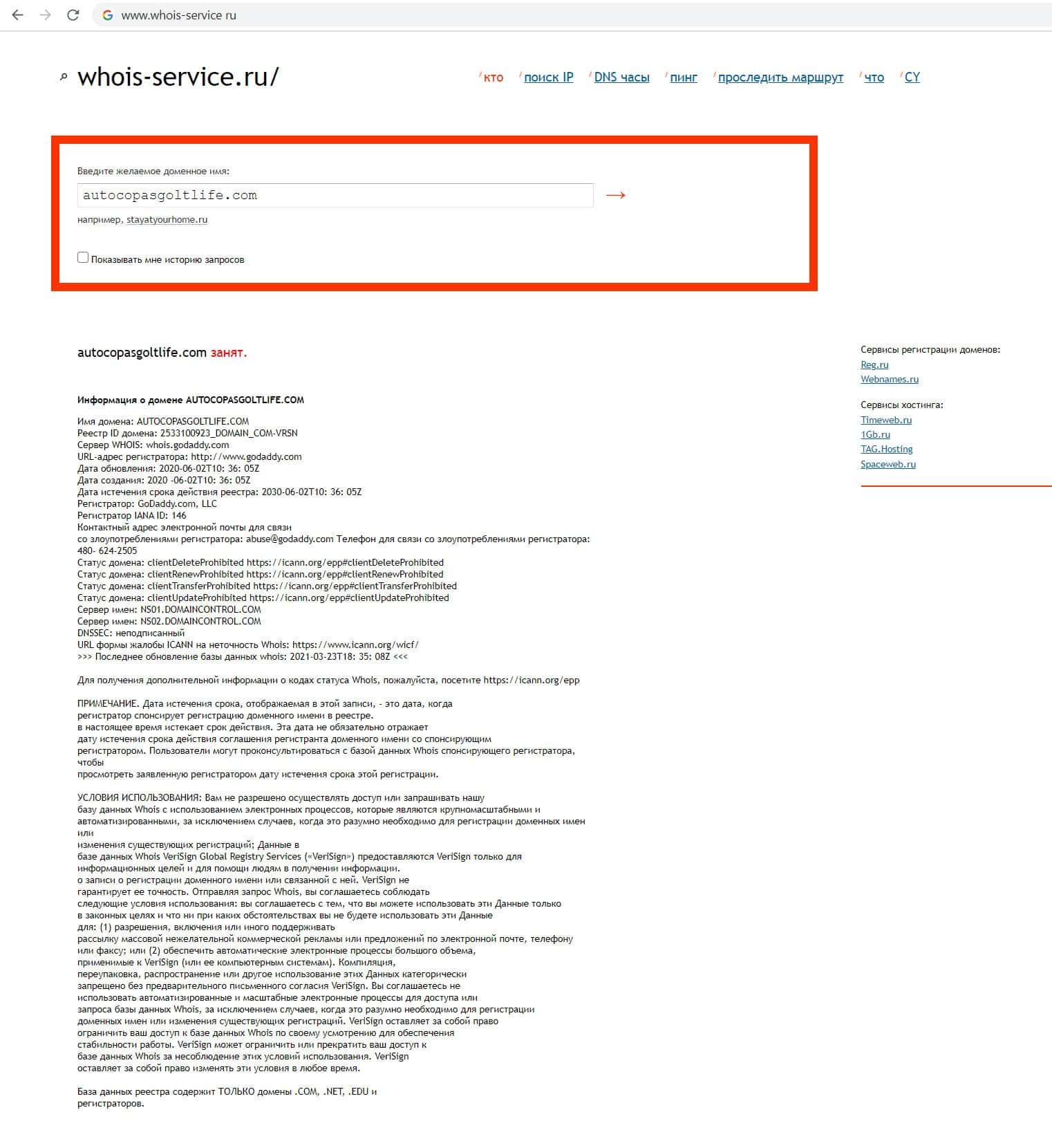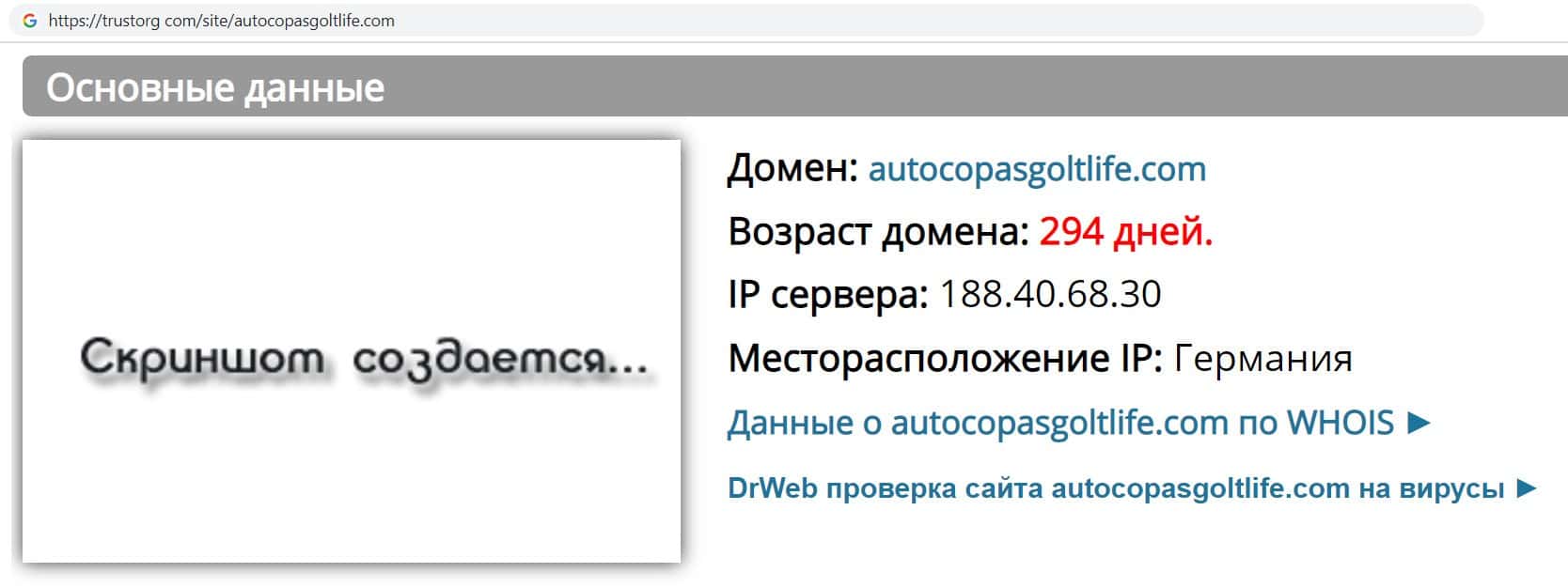 - Информация о возрасте главного сайта мошенников AutoCopasGoltLife