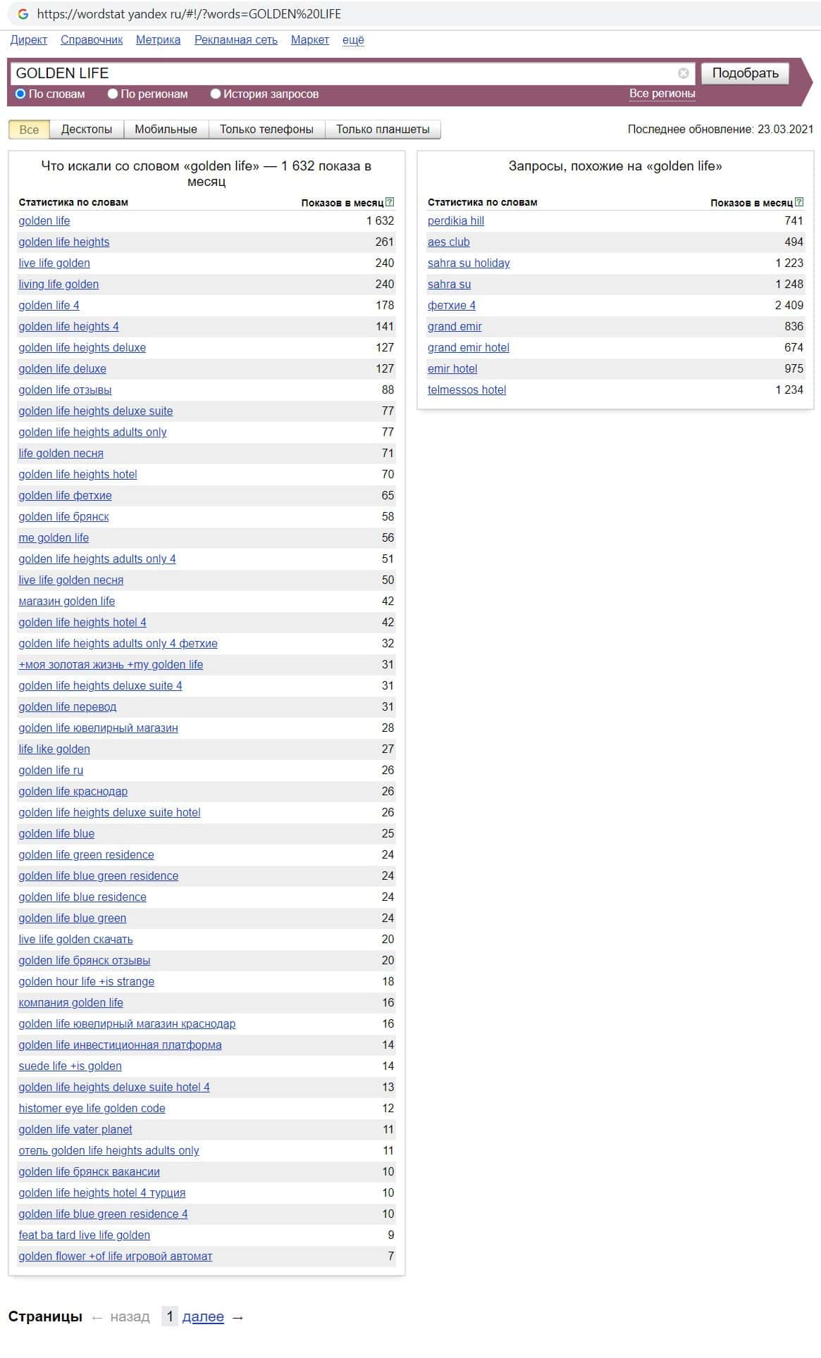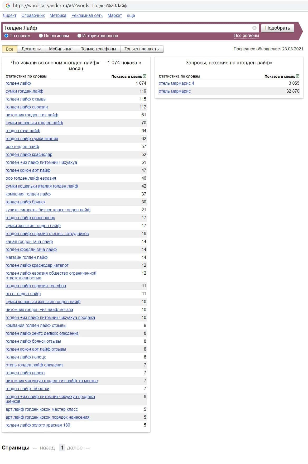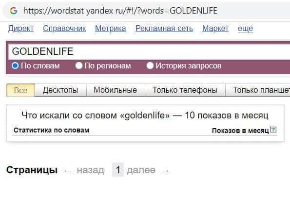 Проверили мы так же количество запросов конторы Голден Лайф по русскоязычному названию, а именно "Голден Лайф". 1074 раза пользователи совершили этот запрос.