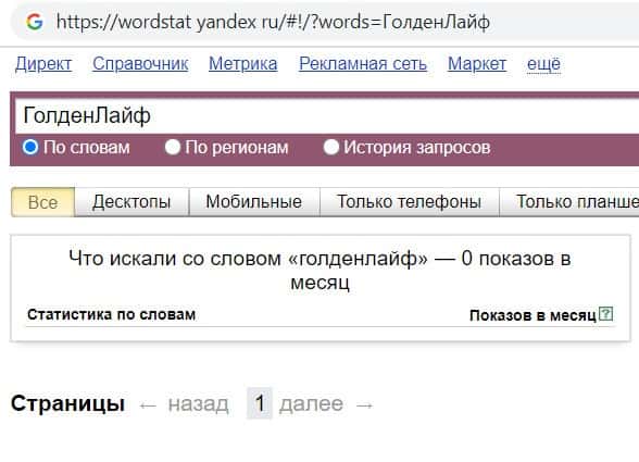 Проверили мы так же количество запросов фирмы AutoCopasGoltLife по русскоязычному названию, а именно "Голден Лайф". Данный запрос пользователи так же не выполняли.