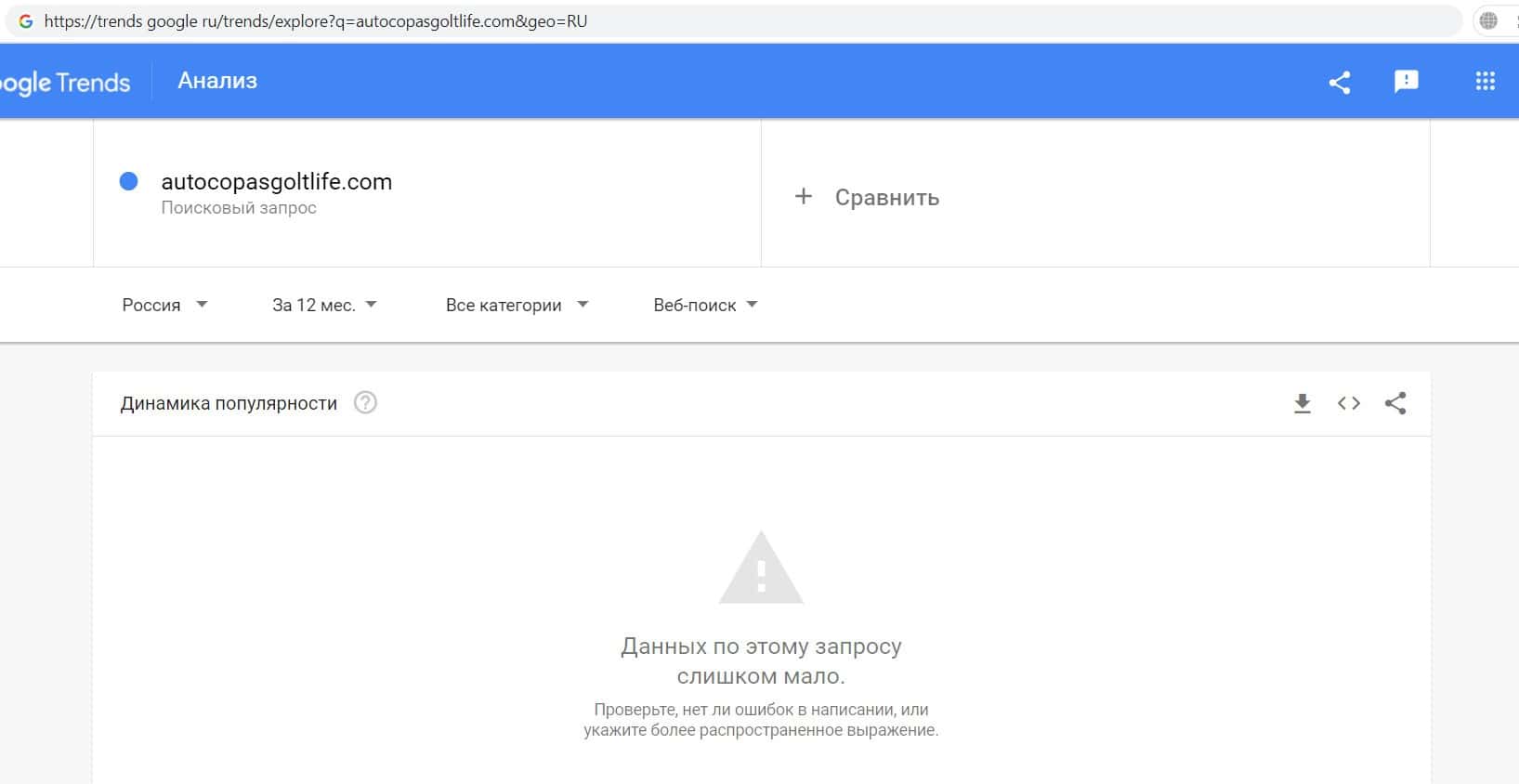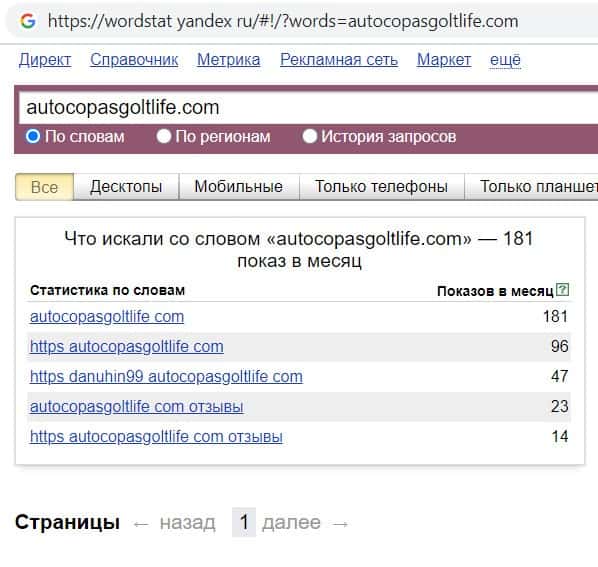 Напоследок мы проверили количество запросов компании разводил Голден Лайф по домену лохотрона с точкой, а именно "autocopasgoltlife.com". Результат оказался нулевым.