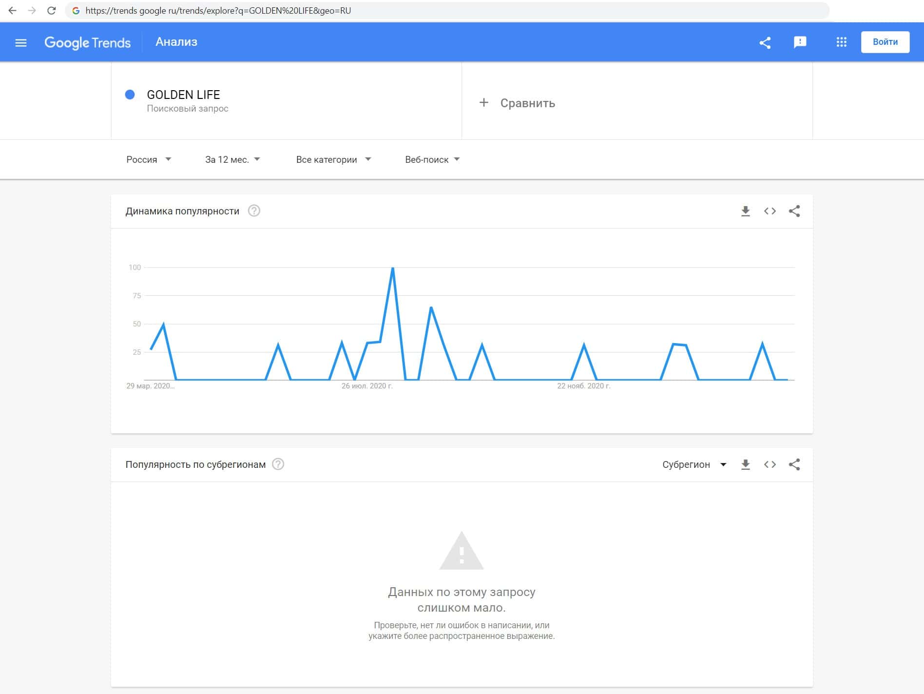 Ещё мы проверили количество запросов компании Голден Лайф по названию конторы, но без пробела, а именно "GOLDENLIFE". Оказалось, что этот запрос никто не выполнял.