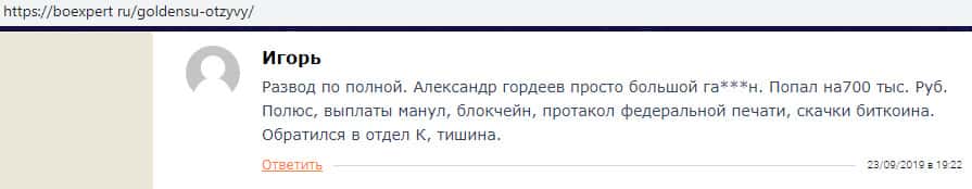 На изображении, расположенном ниже, вы можете увидеть негативный комментарий в сторону аферистов GoldenSU, который связан с тем, что жулики Голден СУ довольно банально и ожидаемо навешали лапши на уши очередному наивному пользователю сети интернет и выманили у него довольно крупную сумму средств, после чего мошенники GoldenSU дали заднюю.