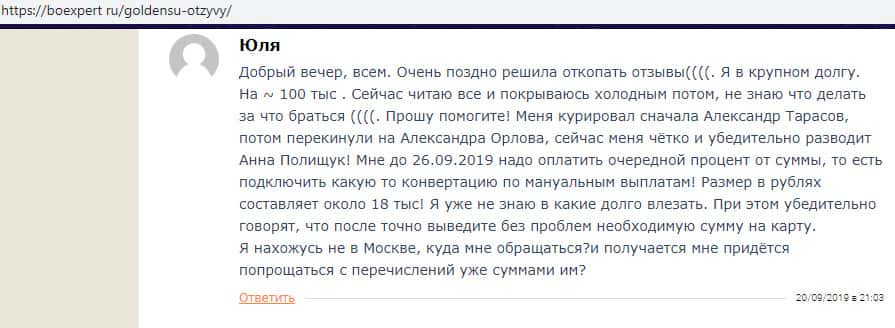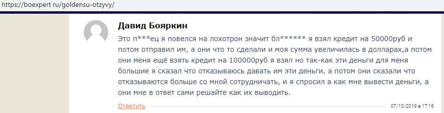 На ниже расположенном изображении вы можете наглядно увидеть очередной реальный негативный отзыв в сторону проходимцев GoldenSU, который связан с тем, что аферисты Голден СУ довольно стандартно развели клиента на взятие кредита, а в дальнейшем ввод кредитных средств в свою помойку, после чего жулики GoldenSU отказались сотрудничать.