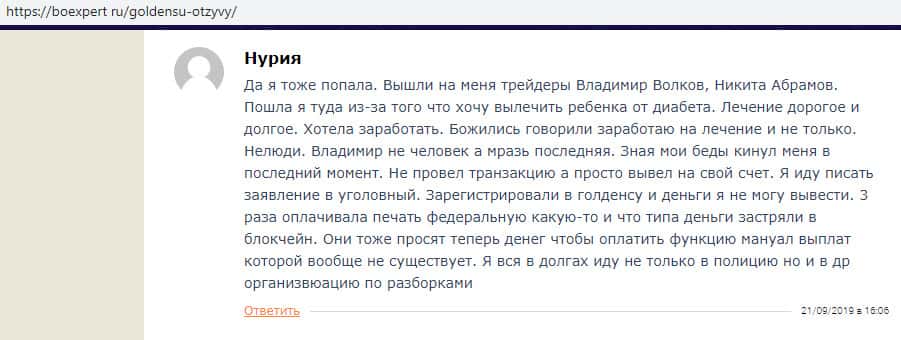 На ниже расположенном изображении, вы можете наглядно увидеть еще один негативный отзыв в сторону мошенников GoldenSU, который связан с тем, что аферисты Голден СУ довольно стандартно и ожидаемо кинули очередного наивного пользователя сети интернет на деньги, после чего мошенники GoldenSU оперативно дали заднюю и попросту слились.