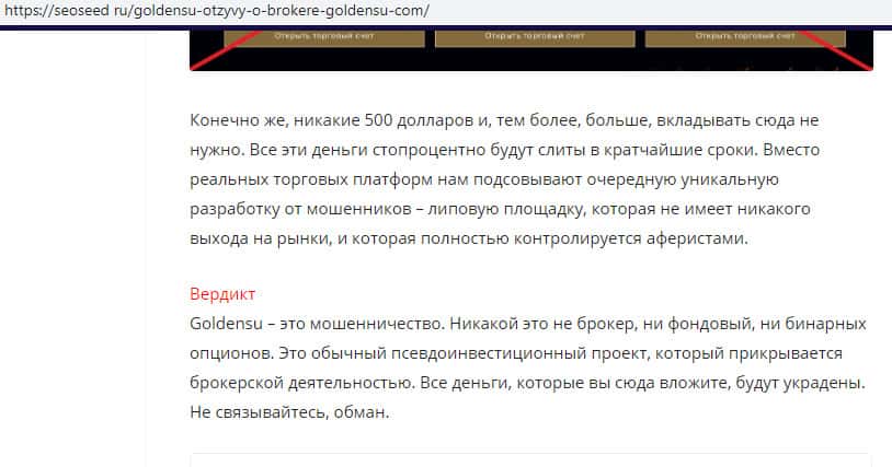 Ввиду мошеннической и противозаконной деятельности мошенников Голден СУ на просторах сети интернет портал сеосеед ру посвятил данной помойке целую статью, в которой определенно не рекомендует иметь дело с мошенниками GoldenSU, так как они является банальным и типичным брокером-мошенником, который собирает деньги с наивных клиентов.