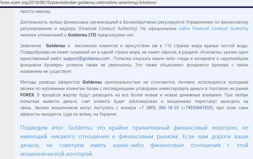 Веб-сайт forex-scam org так же посвятил жуликам GoldenSU информационную статью, в которой расписал основные аспекты деятельности мошенников Голден СУ, по итогам которых веб-площадка форекс-скам орг не рекомендует иметь дело с аферистами GoldenSU. На изображении, расположенном ниже, вы можете наглядно увидеть выводы о шулерах.