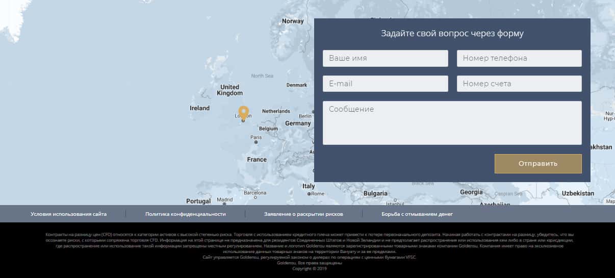 Завершается же сайт у аферистов GoldenSU довольно типично и ожидаемо, а именно банальной формой для связи с наивной клиентурой, а так же предупреждением о рисках, в которых мошенники Голден СУ отказываются за потери наивной клиентуры, связанные с данным подвальным сайтом. На изображении ниже вы можете увидеть окончание сайта шулеров.