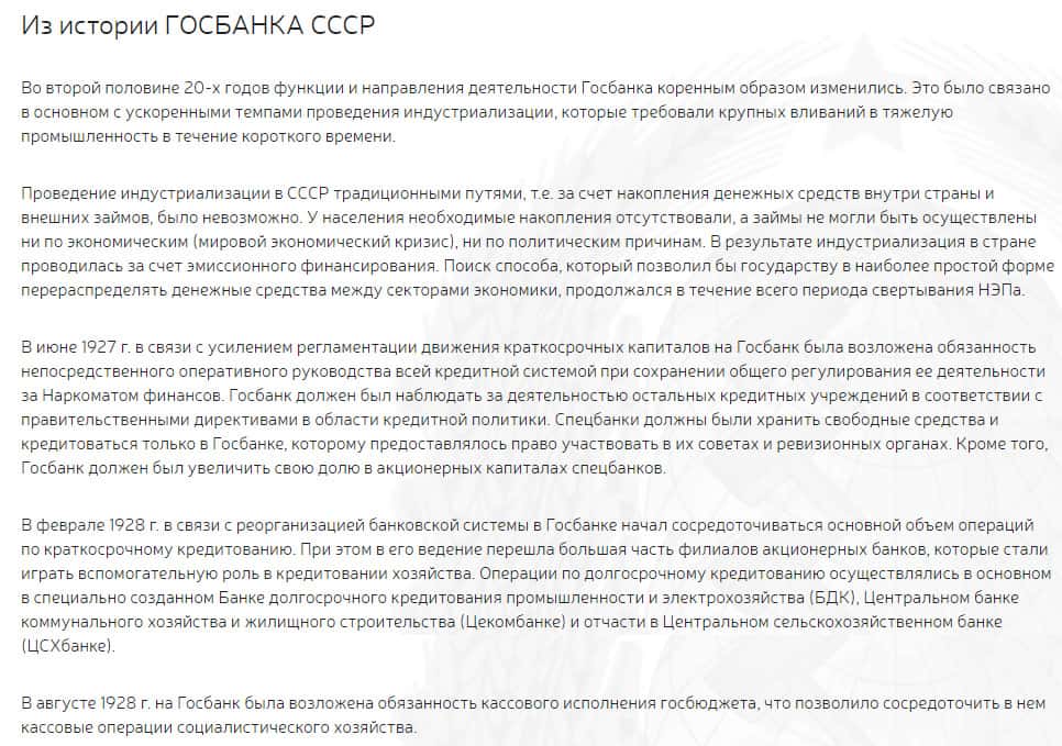 И напоследок, хотим закончить анализ интернет-площадки махинаторского инвестиционного центра ГОСБАНК СССР разделом, который занимает половину все информации, содержащейся на данном одностраничном портале. Эти злодеи посвятили уйму информации о истории ГОСБАНК СССР времен 1927-1928 годов. В общем, прилепили какую-то небылицу, чтобы хоть как-то заполнить контент сайта.