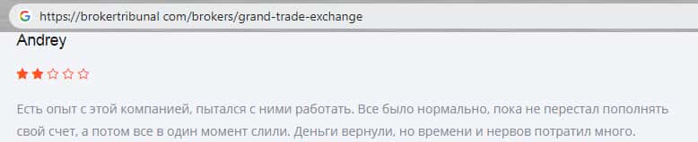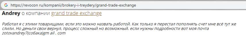 Как рассказывает пользователь на одном сайте с отзывами о разных брокерах, эти мошенники из конторы Гранд Трейд Эксчэндж забрали деньги пользователя себе, из-за того, что он перестал пополнять свой счет. Из этого может вытечь то, что мошенники специально заставляют инвестировать в их шарашкину контору, чтобы разводить людей на большие деньги.