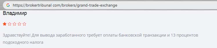 Шарашкина контора GrandTrade Exhange нашла новый способ заработка на своих брокерах! Это большие проценты и оплата транзакции. Процент, который с Вас изымут, составляет тринадцать процентов. Гневный отзыв такого типа оставил пользователь на одном из сайтов в сети, и он очень не доволен этим фактом, потому что его в наглую обворовывают.