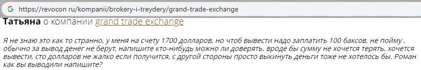 По словам пользователя сети, который оставил гневный комментарий на одном из форумов, брокер требует деньги за вывод средств. У пользователя накопилась достаточно большая сумма, но шулера и кидалы GrandTrade Exchange решили заработать себе денег, и создал большую комиссию в размере ста долларов США. Мошенники наживаются на Вас.