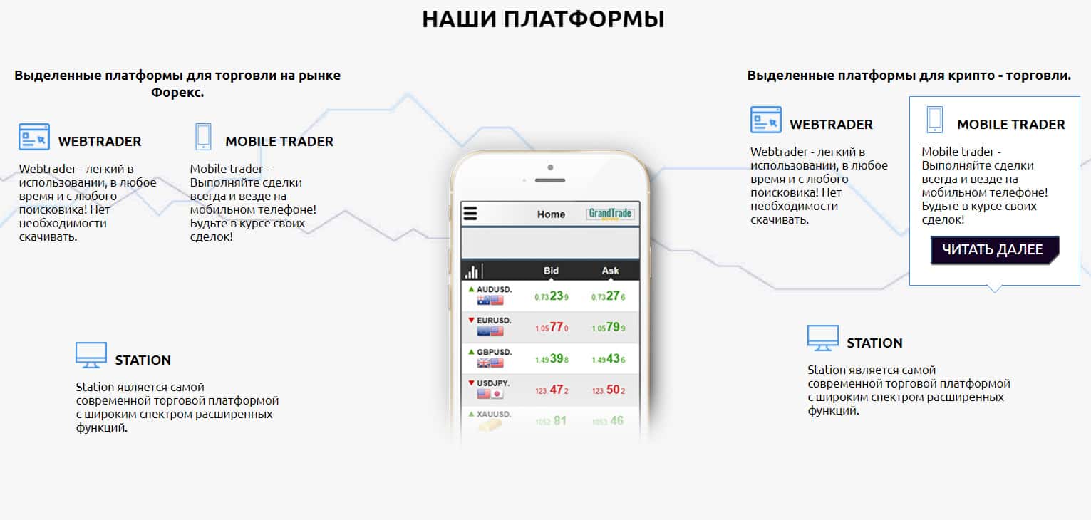 Далее, спускаясь по сайту мошенников, мы видим на каких платформах работает всё это разводилово от компании Гранд Трейд Эксчэндж. Они предлагают Вам зарабатывать как в компьютерной версии, так и на Android-платформе. Самое интересное, что можно отсюда отметить, это то, что контора не работает со стандартной платформой МТ4, что является странным.