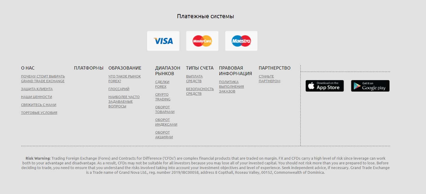 В конце своего днищенского сайта, шулера Гранд Трейд Эксчэндж расположили платежные системы, через которые можно вносить свои деньги, чего мы Вам не рекомендуем от слова совсем. Кроме того, в самом конце расположено множество самых вкладок, таких как "о нас" "платформа" и так далее. Что больше всего настораживает - малое количество информации.