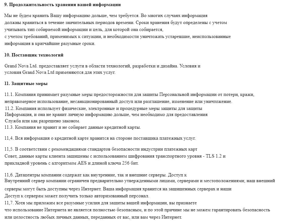 Под конец документа о политике конфиденциальности, мошенники Гранд Трейд Эксчэндж описывают то, сколько же хранится Ваша информация, которую Вы добровольно, сами того не зная, дали. Шулера не говорят какое время они могут хранить информацию, ссылаясь на "не больше требуемого времени". Какого времени - никому не известно. Отмечены и другие пункты.