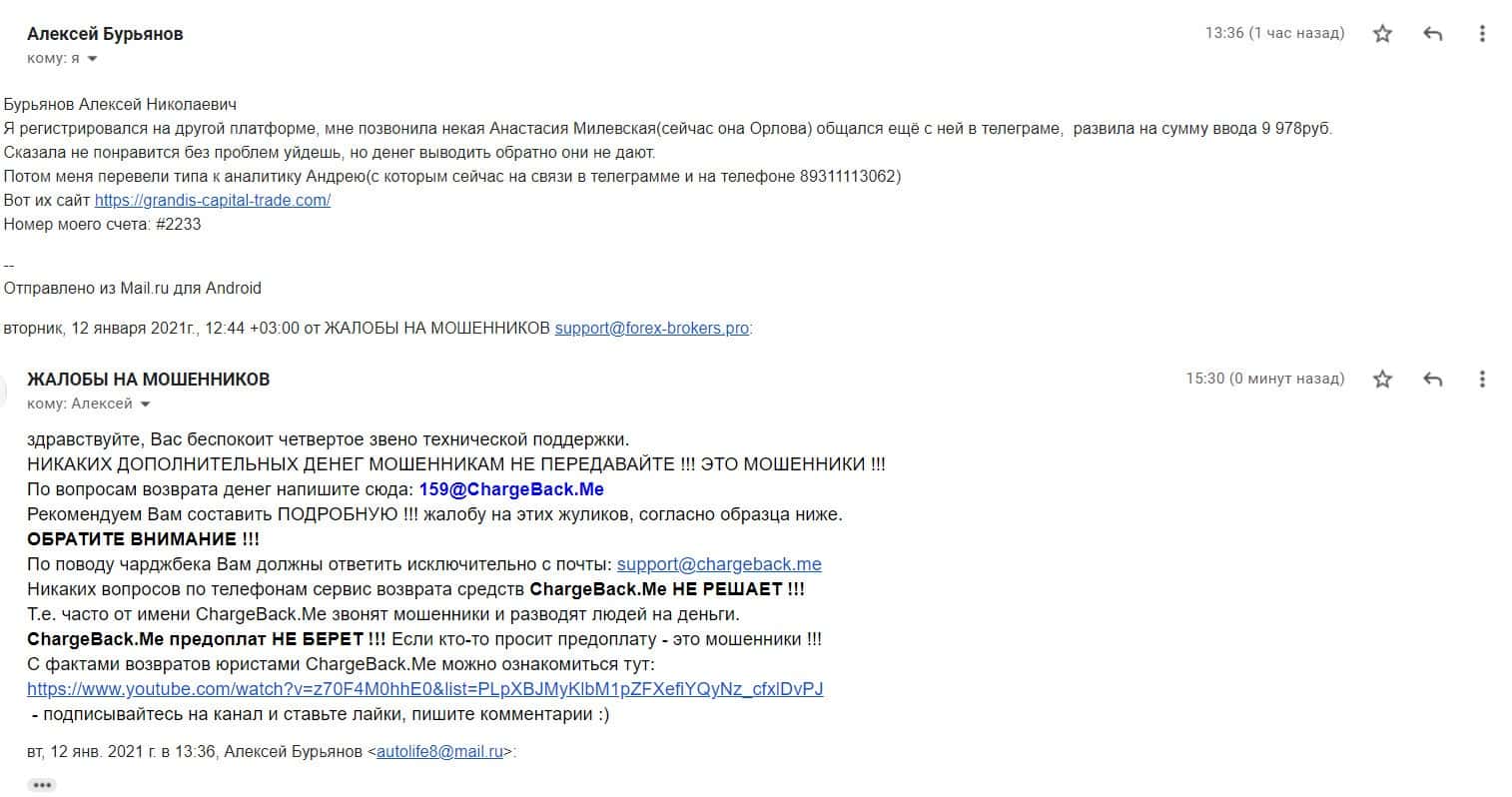 На почтовый адрес сайта по сбору информации о деятельности мошенников форекс пришла жалоба о скам-брокере Грандис Капитал Трейд, пострадавший оставил их контактные данные: