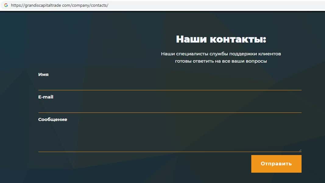 Шулера Грандис Капитал Трейд на своем официальном интернет-ресурсе указывают адрес электронной почты, а именно: