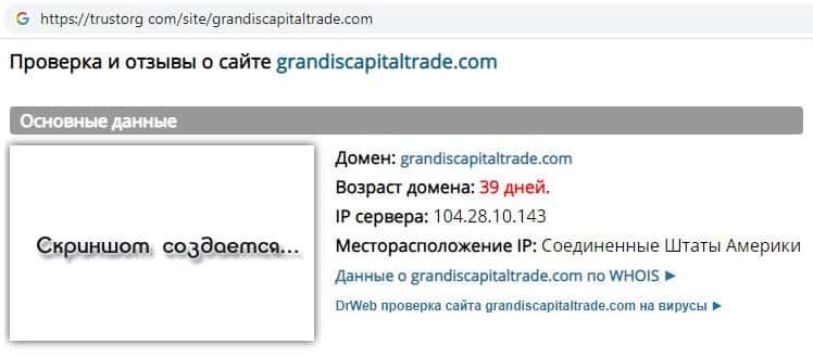 Проверка интернет-сервиса жульнической конторы Грандис Капитал Трейд на trustorg com показала, что возраст домена к моменту написания статьи составляет 39 дней.