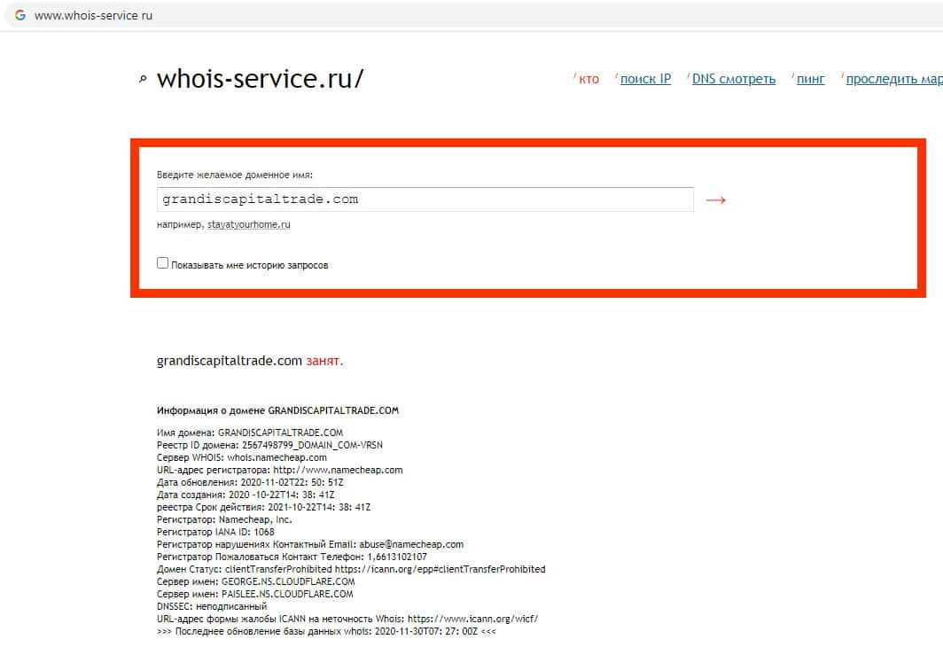 Сервис whois-service ru не может найти данные о владельце домена сайта мошеннической организации Грандис Капитал Трейд, доверять сайту данной скам-конторы нельзя.