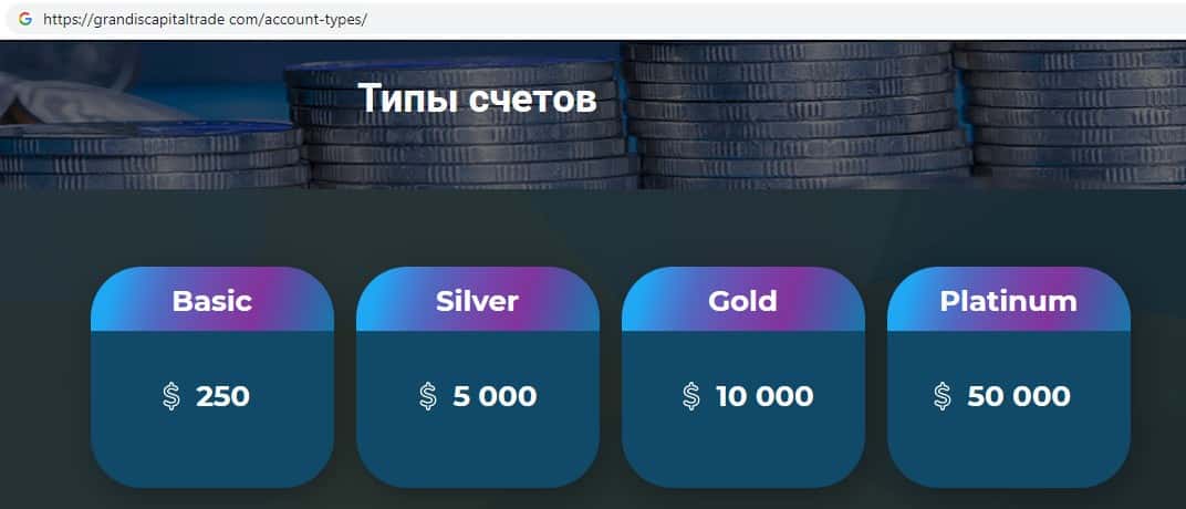 Аферисты Грандис Капитал Трейд предлагают клиентам на выбор 4 типа торгового счета: Basic, Silver, Gold, а также Platinum. Реальный форекс стартует в основном с суммы в 100000 $.
