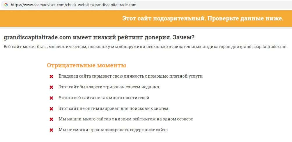 Проверка Grandis Capital Trade на сайте scamadviser com показала, что у данного сайта низкий рейтинг, а также выявлено множество отрицательных моментов в работе сервера.