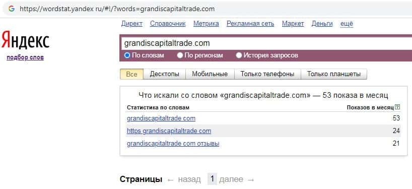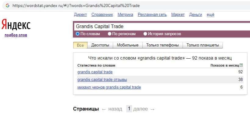 Количество брендовых запросов англоязычного названия компании "Grandis Capital Trade" на wordstat yandex ru составляет 92 запроса за месяц.