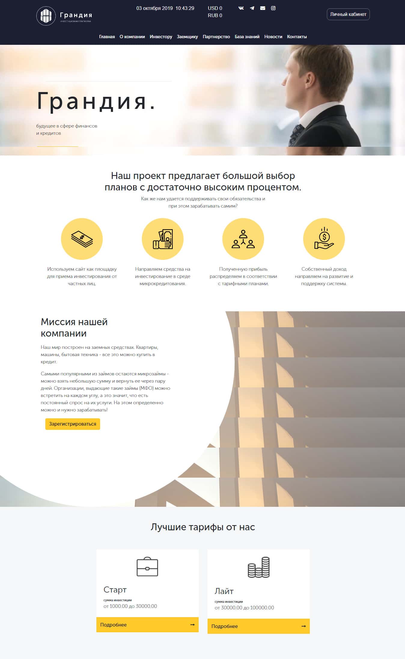 Если внимательно посмотреть как создан ресурс шараги Grandiya, то можно четко заявить, что перед нами стоит хайп, который скрывается под кредитно-инвестиционной организации. Жулье предлагает различные тарифы и мгновенное начисление процентов. Обычно такие лохотроны долго не живут.