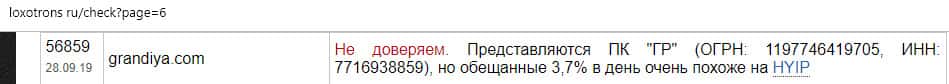В данном случае нам удалось найти информацию, которая касается деятельности мошеннической шараги Grandiya. Она представляется в реестре компаний как ПК "Грандия", но на самом деле их 3,7% в день, которые жулики обещают больше похоже на хайп. Поэтому не рекомендуем связываться с шаражниками Грандия.