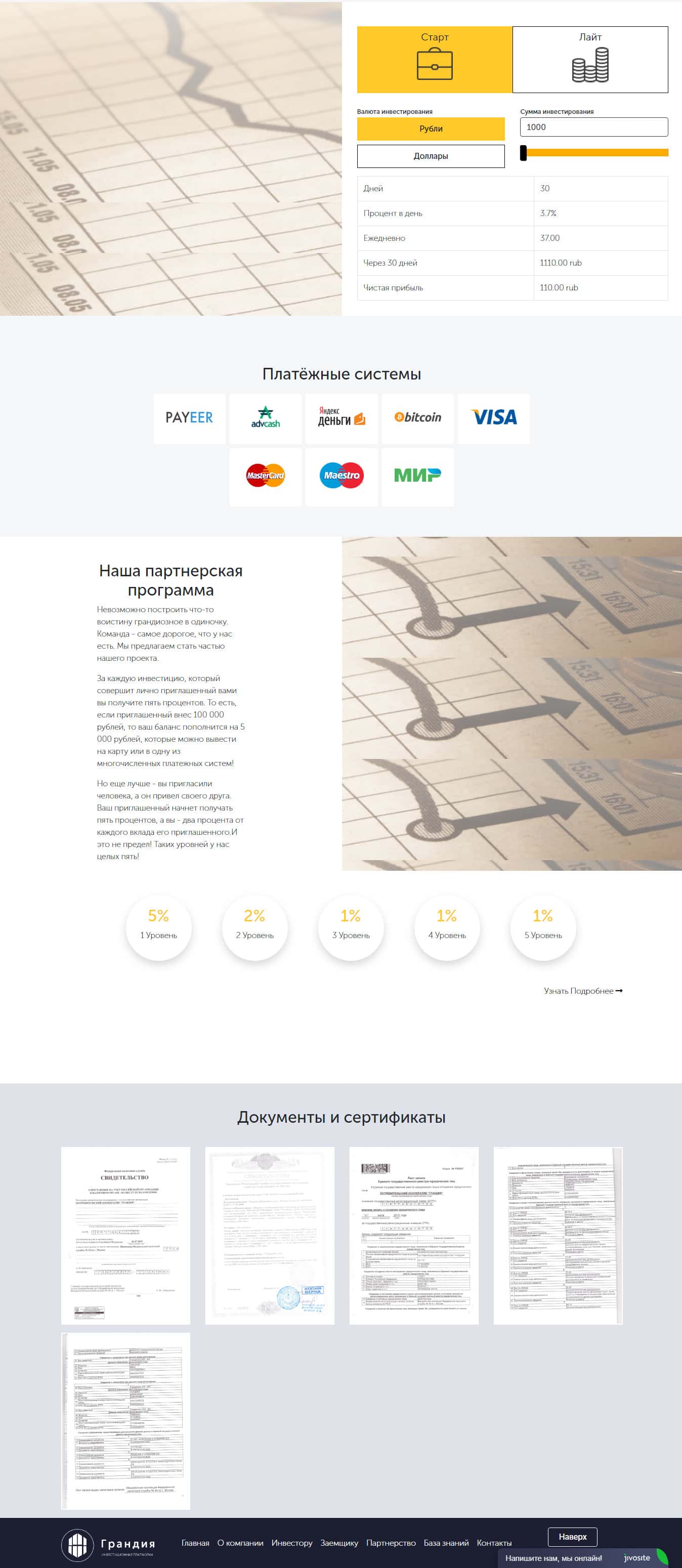 Рассмотрев сайт конторы Grandiya дальше также стоило отметить, что они заманивают новых лоховодов с помощью партнерской программы по уровням. То есть если больше привлечешь жертв к ним в ловушку, тем больше получишь. А это точно уже даже смахивает на элементы финансовой пирамиды.