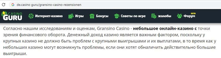Гранзино - еще один тотализатор по разводу интернет пользователей! Аферисты предлагают перечень азартных игр, но при этом расставляют хитрые ловушки, чтобы игроки не могли вывести крупные суммы выигрышей! Одним словом, оффшорная контора Гранзино работает исключительно на свой карман. В сети Интернет имеется информация об этом мошенническом казино, в данной статье со всем можно ознакомится. Советуем не играть в онлайн-кизино Gransino!
