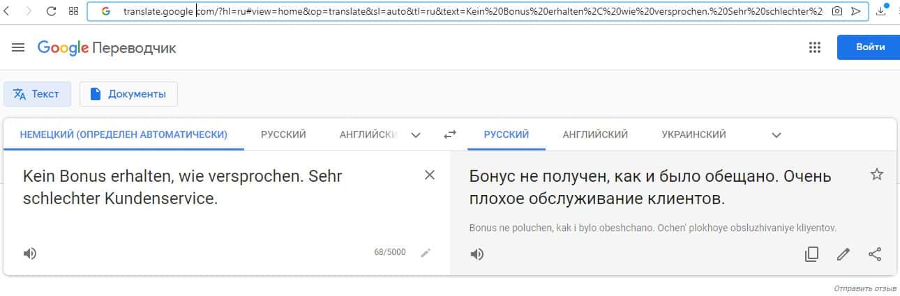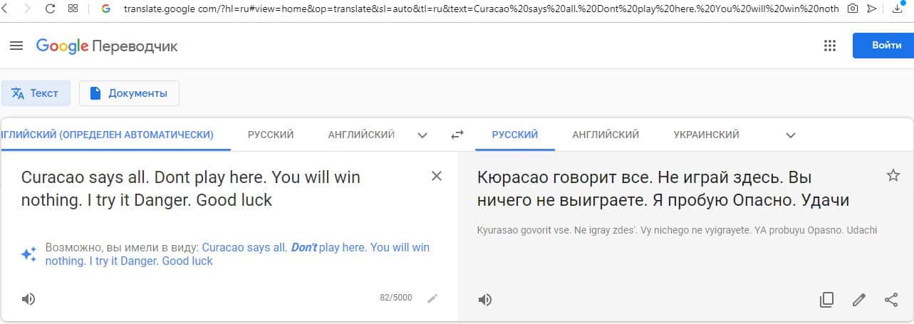 Перевод текста о тотализаторах Гранзино сделан на сайте translate google com.