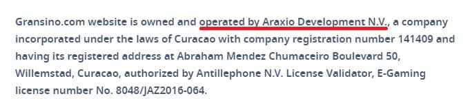 На своем официальном сайте шарлатаный Гранзино указывают, что ответственность за шарагу берет на себя юридическое лицо Araxio Development N.V. под юрисдикцией Кюрасао.