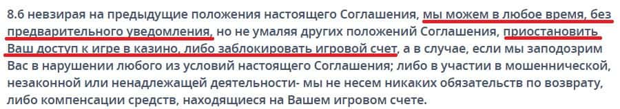 Есть даже такой пункт в клиентском соглашении, в котором лоховоды Gransino открыто заявляют, что в любой момент без уведомлений могут заблокировать доступ игрока к аккаунту.